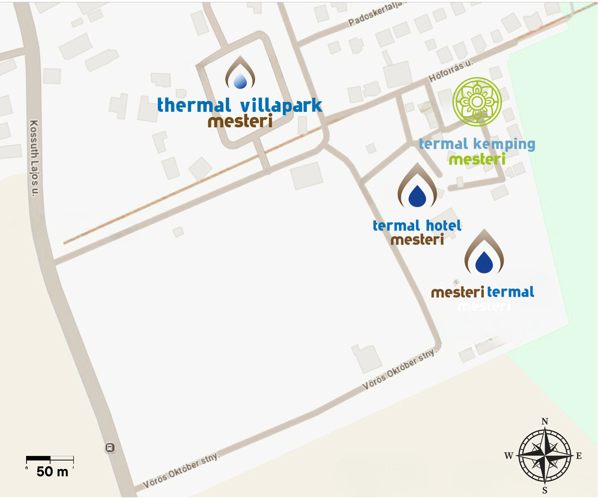Mesteri közelében 1964-ben végzett szénhidrogén kutató fúrás tárt fel termálvizet, melyre alapozva a községben ma már kis családias hangulatú termálfürdő üzemel, a teljes feltöltődés élményét kínáló olyan szálláshelyekkel, mint a Termal Hotel Mesteri, Termal Kemping, és a legújabb egyedülálló attrakció a Thermal Villapark Mesteri. Ez utóbbiban az apartmanházak fedett teraszán, privát, termálvizes dézsákban élvezhetik vendégeink a gondtalan pihenést, miközben egészségük megőrzéséért is tesznek. A termálfürdő az 1800 méteres mélységből feltörő 72 fokos termálvízre települt. A kutak vize a kálcium - magnézium - hidrogén karbonátos termálvizek csoportjába tartozik, magyar szóhasználattal -földes-meszes- vizeknek nevezzük.